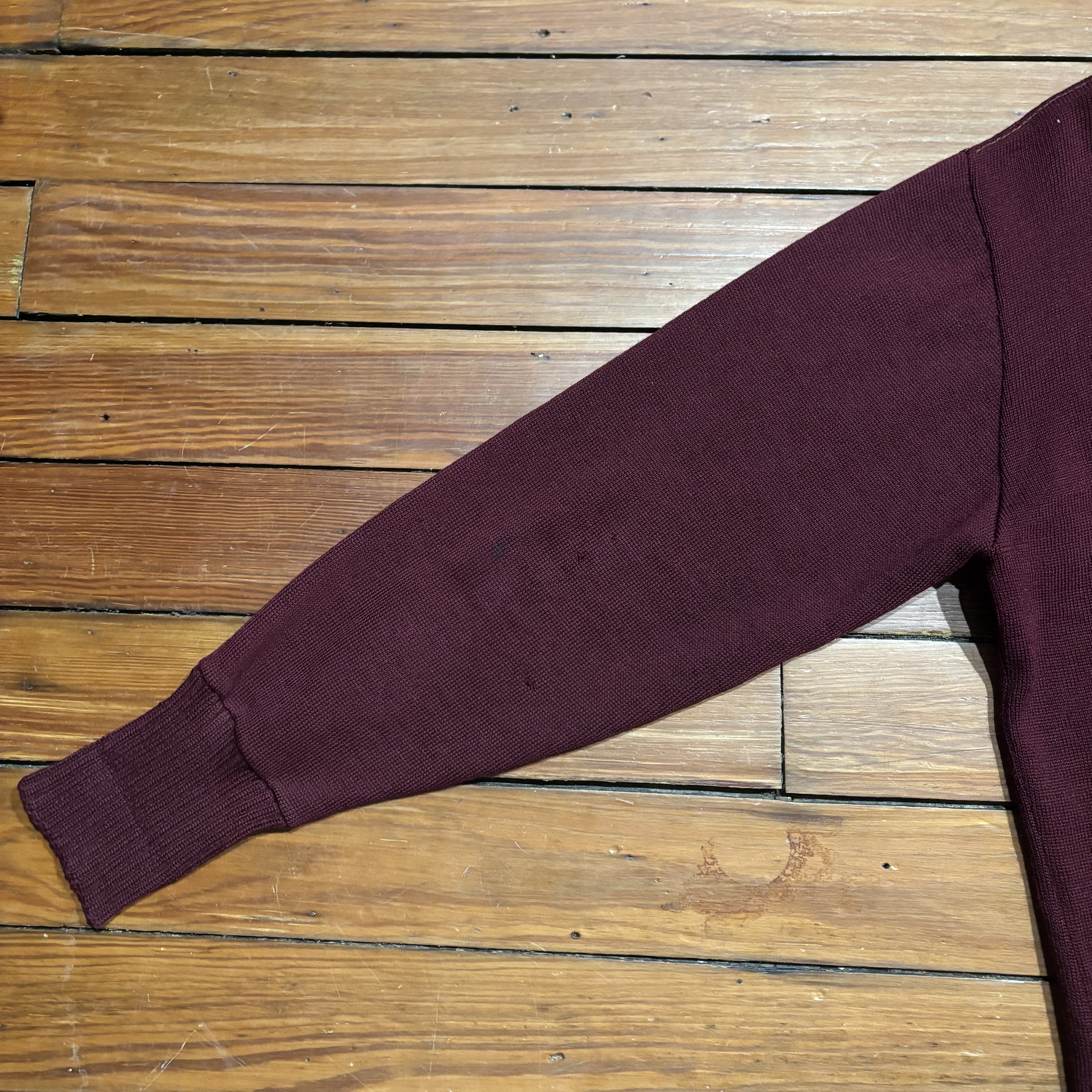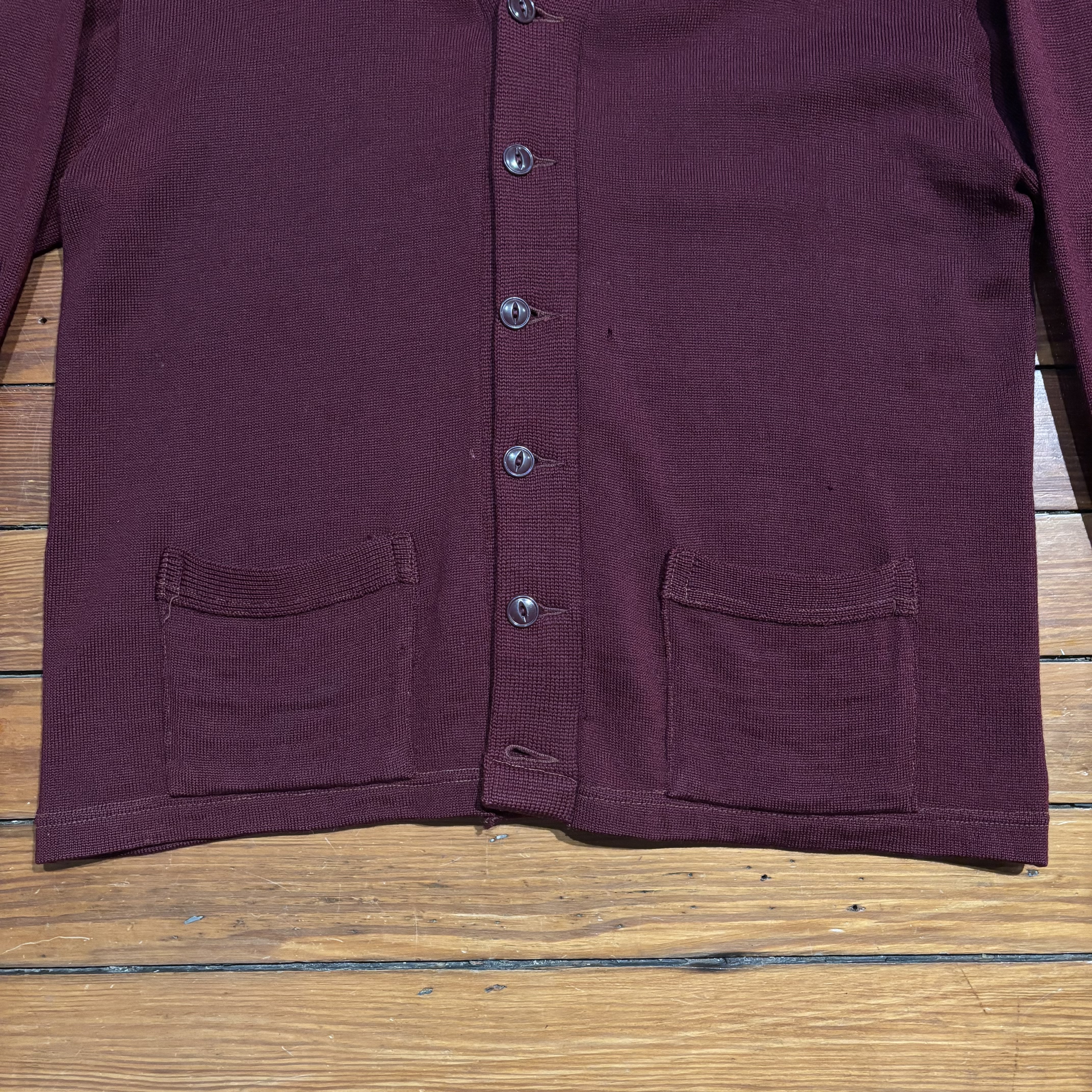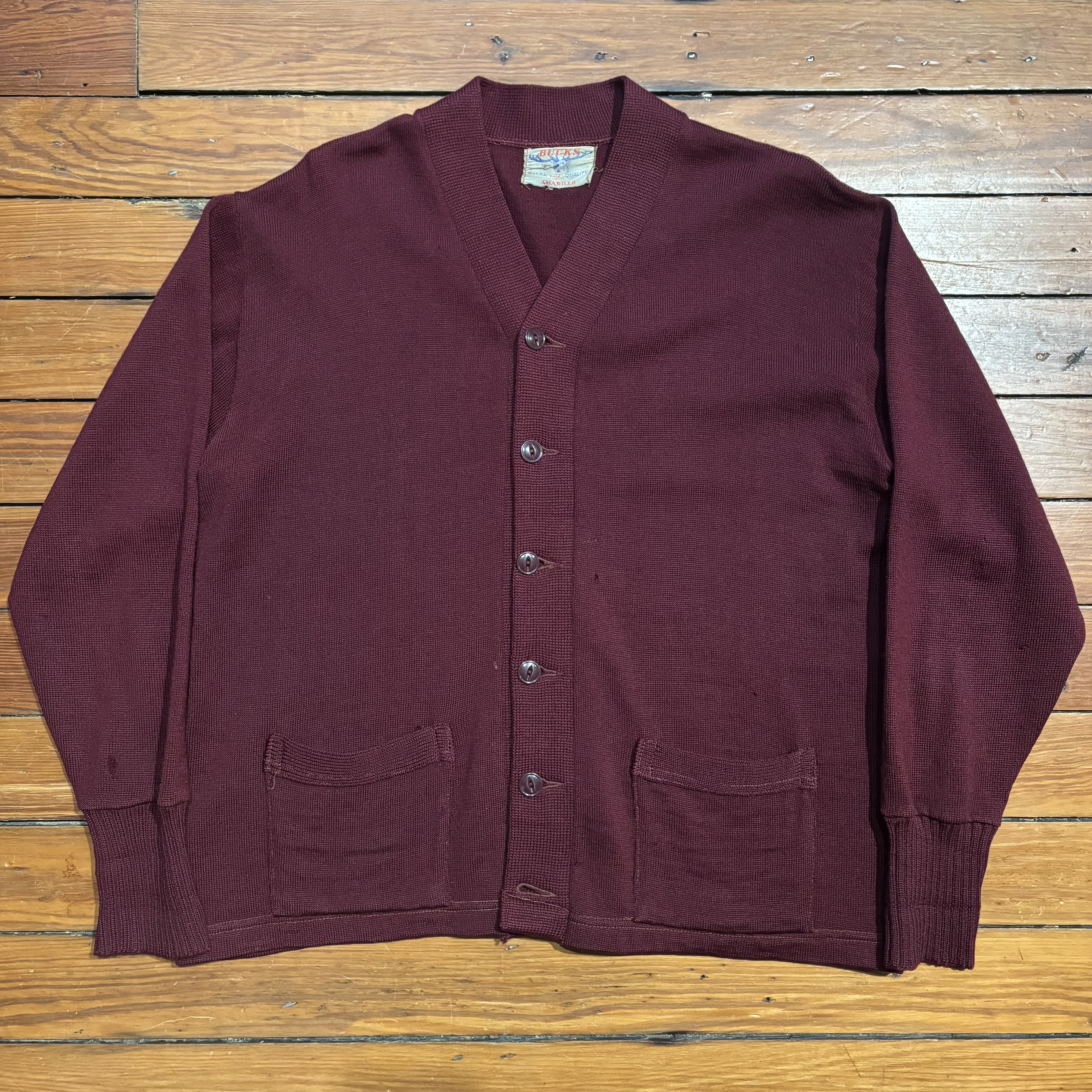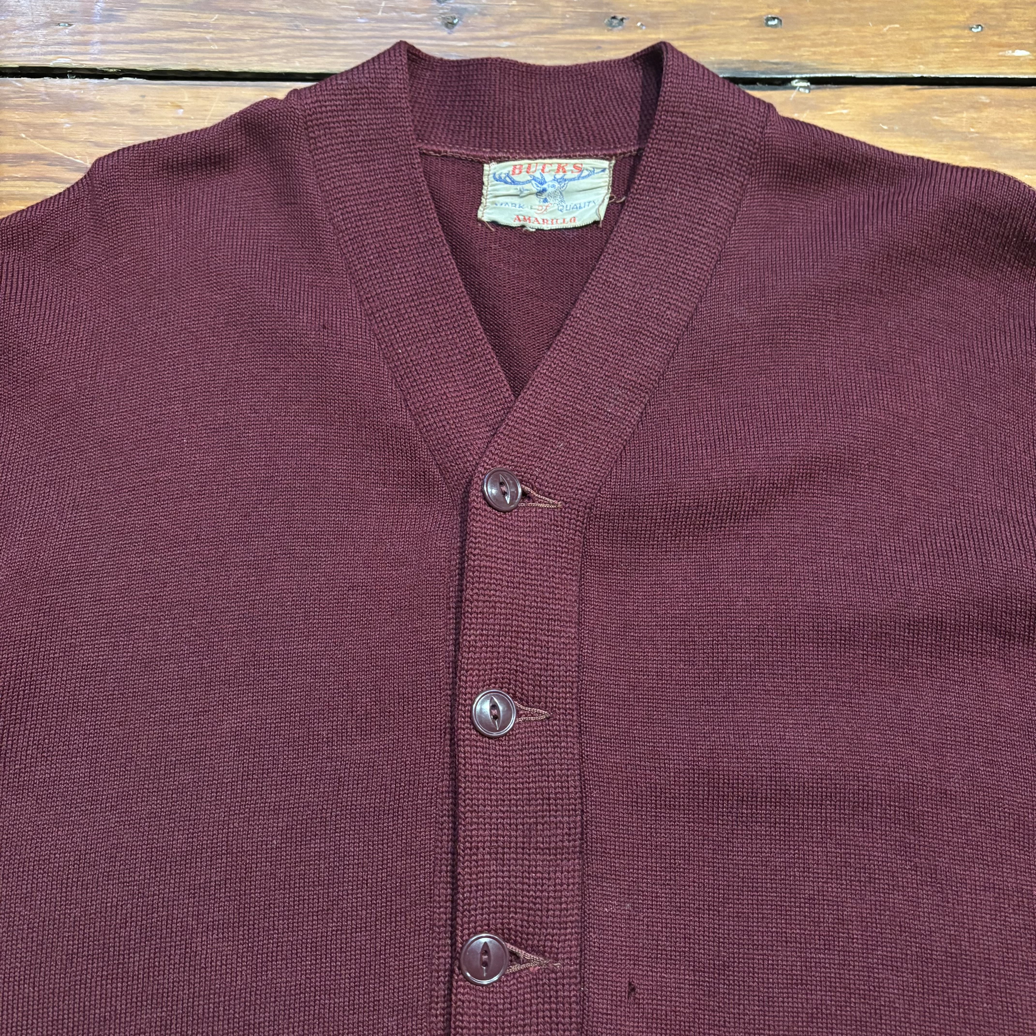 Vintage Bucks of Amarillo burgundy wool cardigan made around the 1940s. Garment features Cats eye buttons, interior name tag, and is made in Texas from 100% wool. Item has a few small holes, as pictured, but is in good condition overall. Cool, classic, ready to wear.