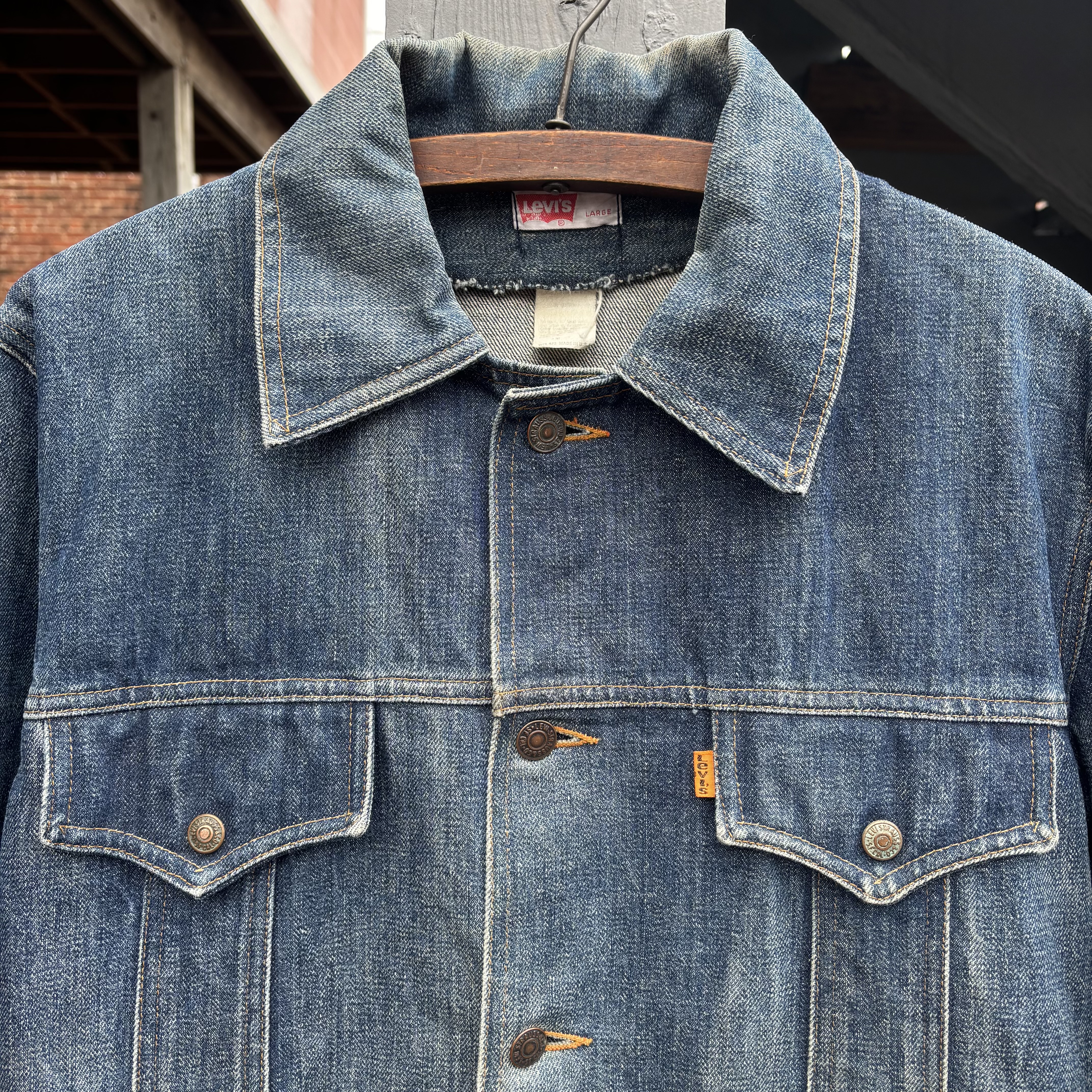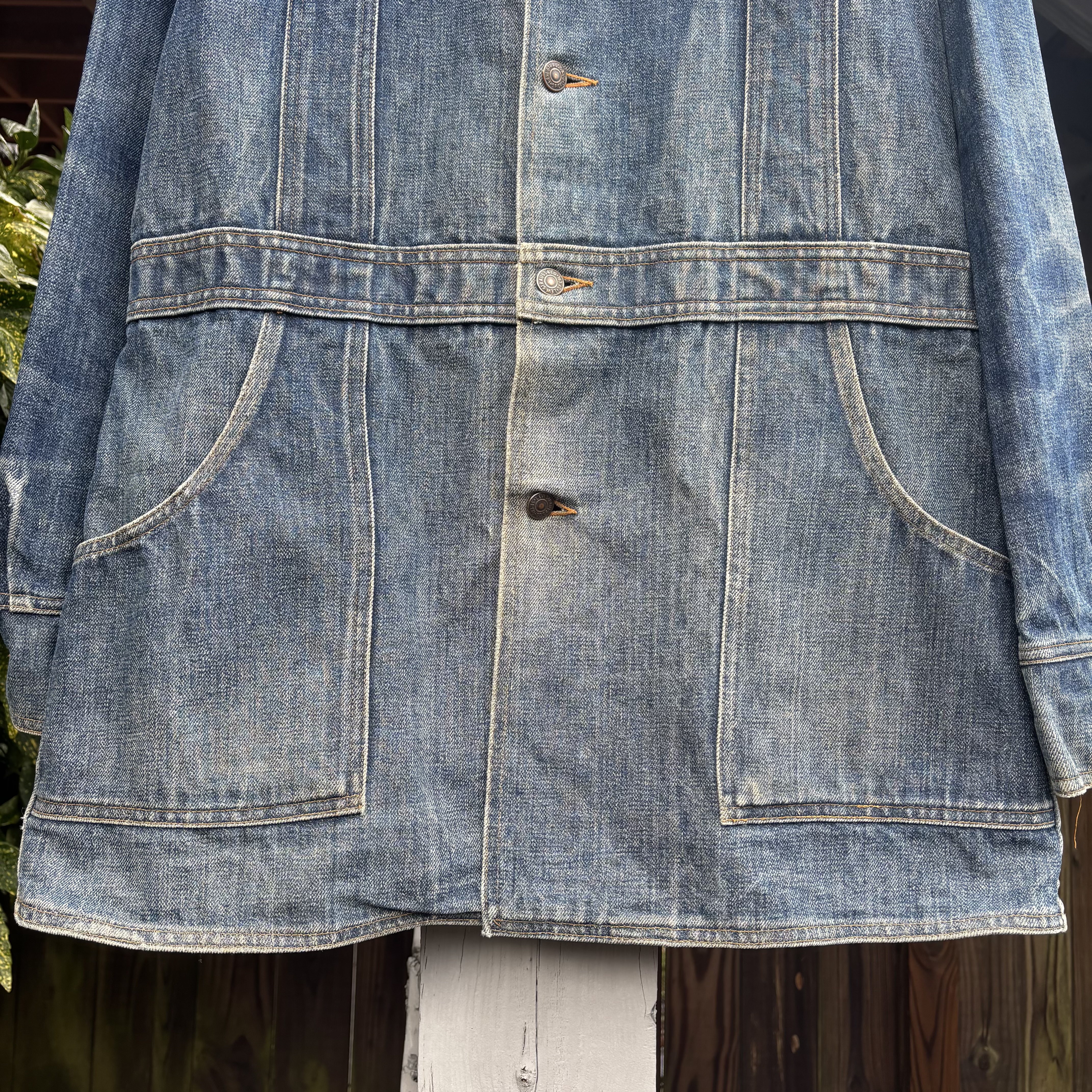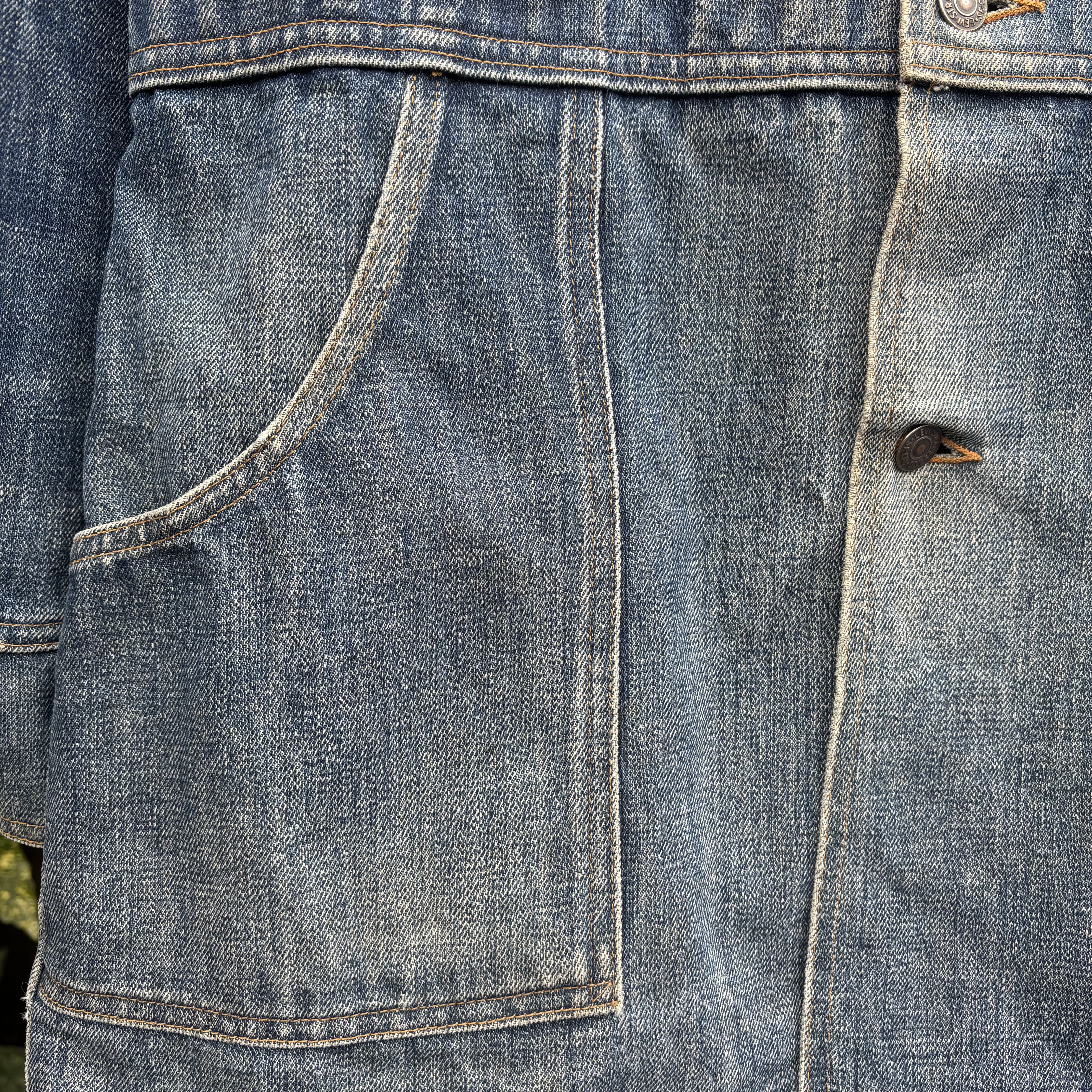 Vintage Levi’s Orange Tab denim bush jacket, made around the 1970s. Item features patch pockets, split hem, and great overall fade. Made in USA from 100% cotton. Has general wear but no major holes or stains. Cool, sturdy, ready to wear.