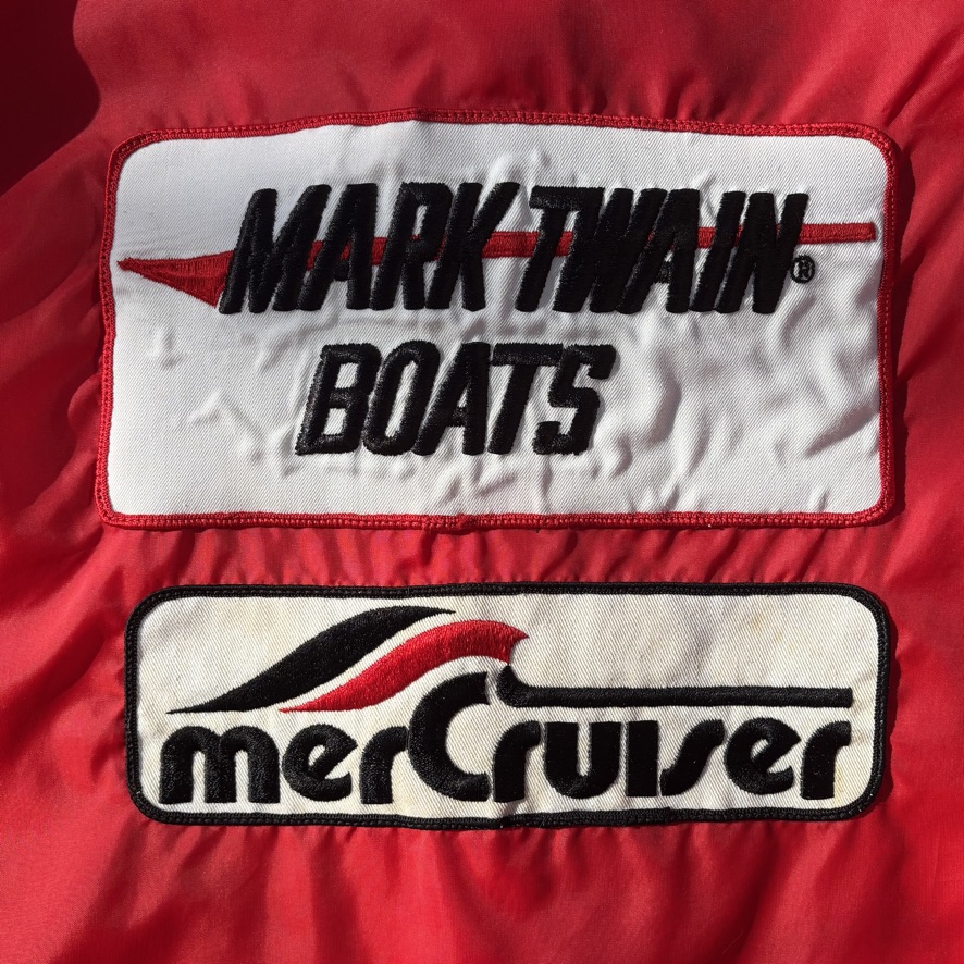 Vintage red nylon boat jacket made by Swingster. Garment features front and back MerCruiser patches and large Mark Twain Boats patch. Patches show slight discoloration but item is in good condition overall with no other staining or holes. 100% Nylon. Made in USA. Light, sturdy, ready to wear.