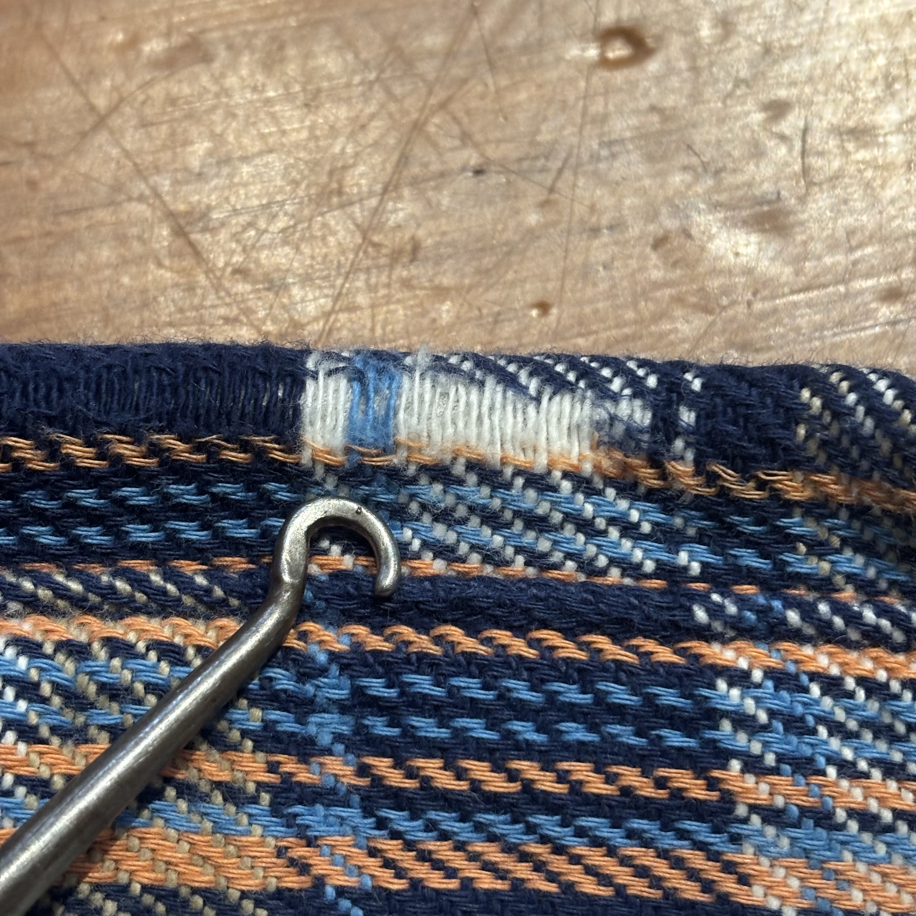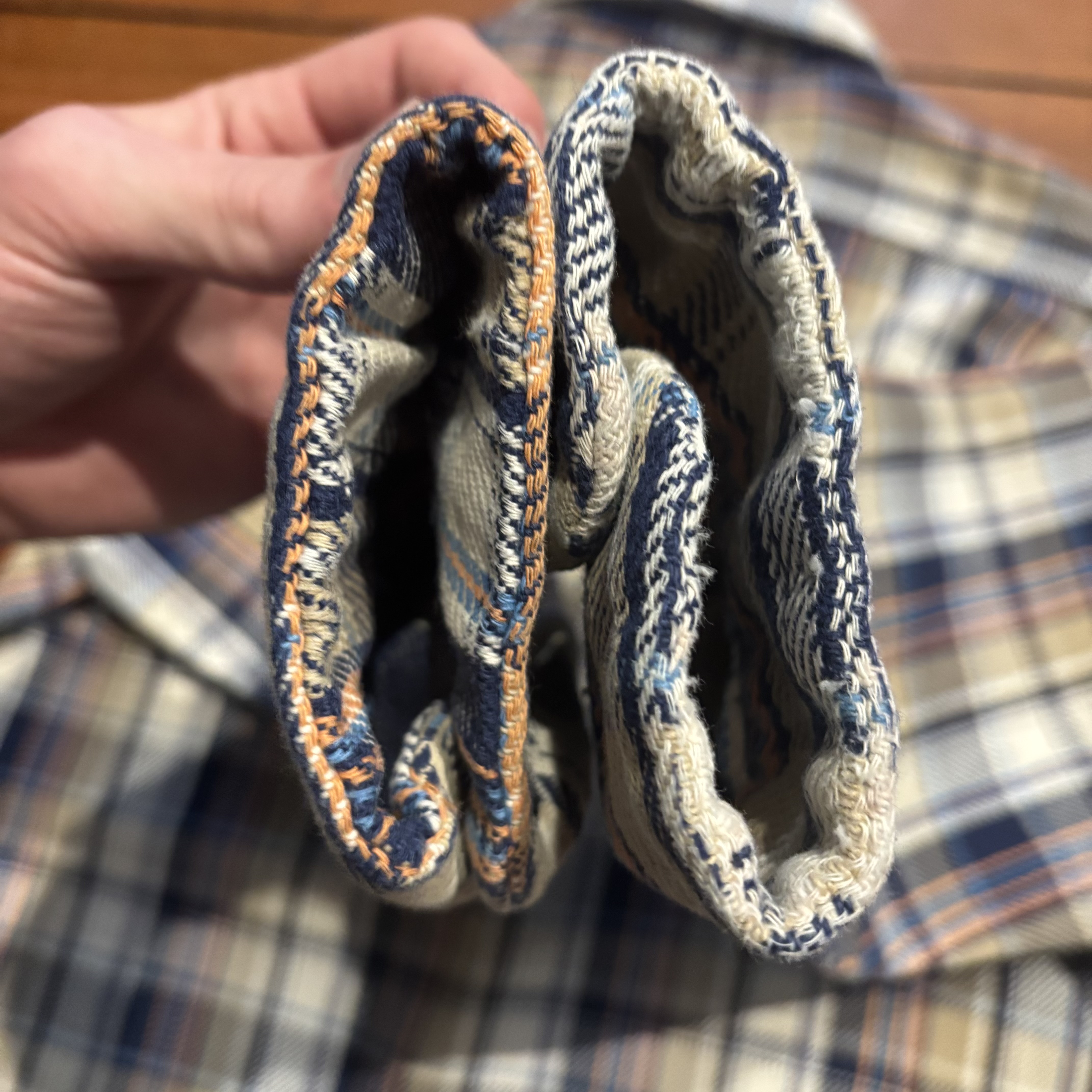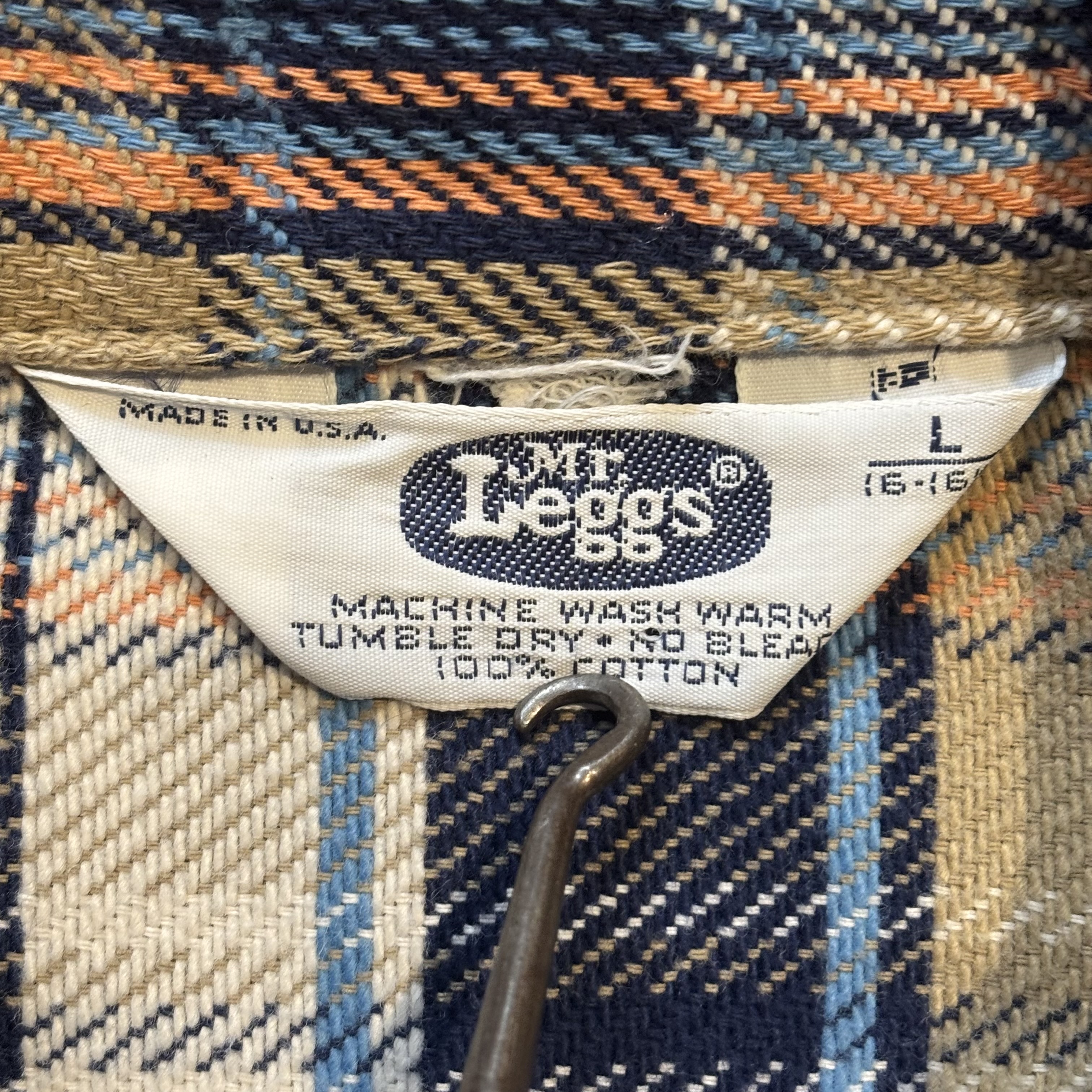 Vintage Mr. Leggs woven cotton flannel made around the 1970s. Features a woven blue, orange, and tan plaid. Garment is made in USA from 100% cotton. Has slight wear to collar and small hole on back, see photos, but is in good condition overall. Clean, soft, ready to wear.