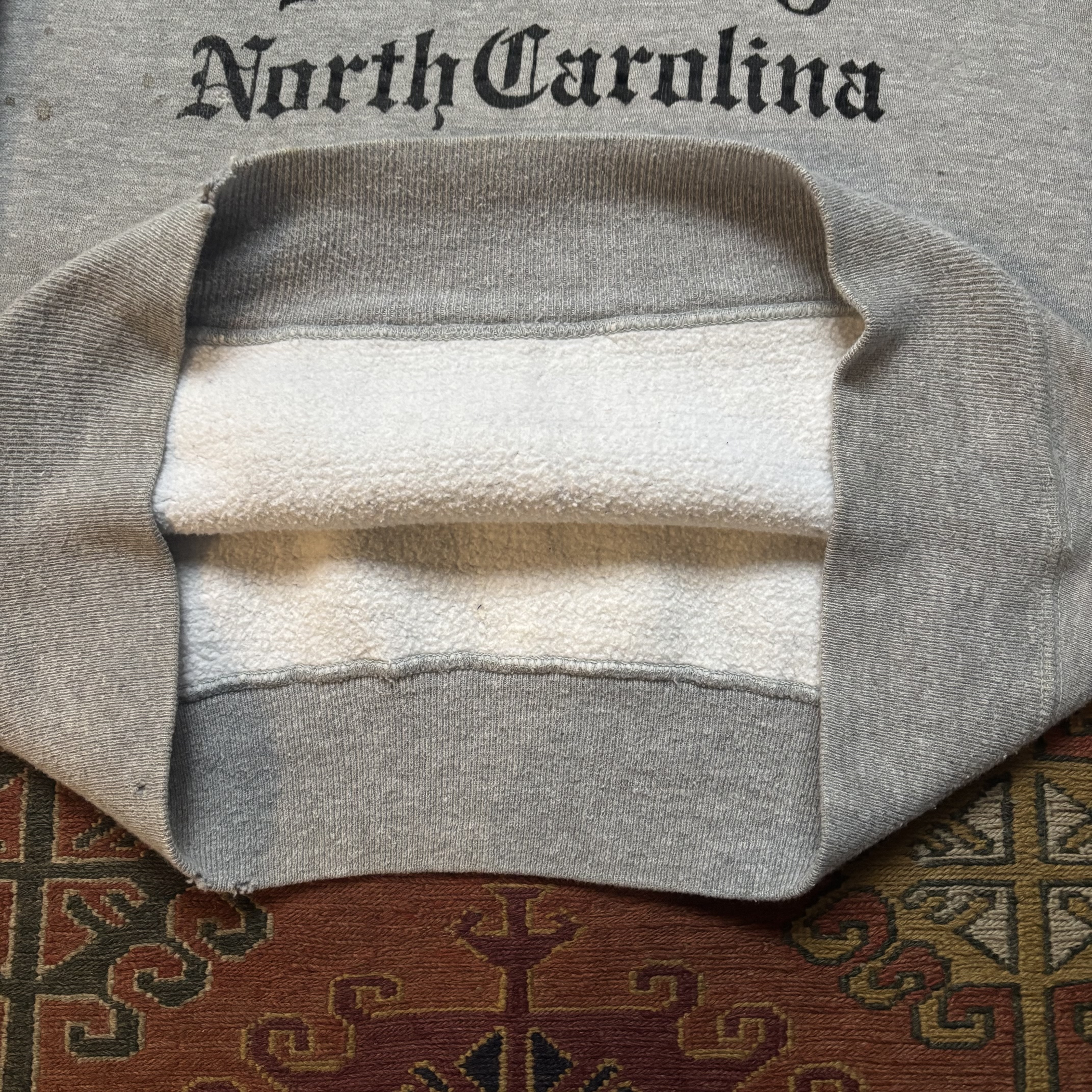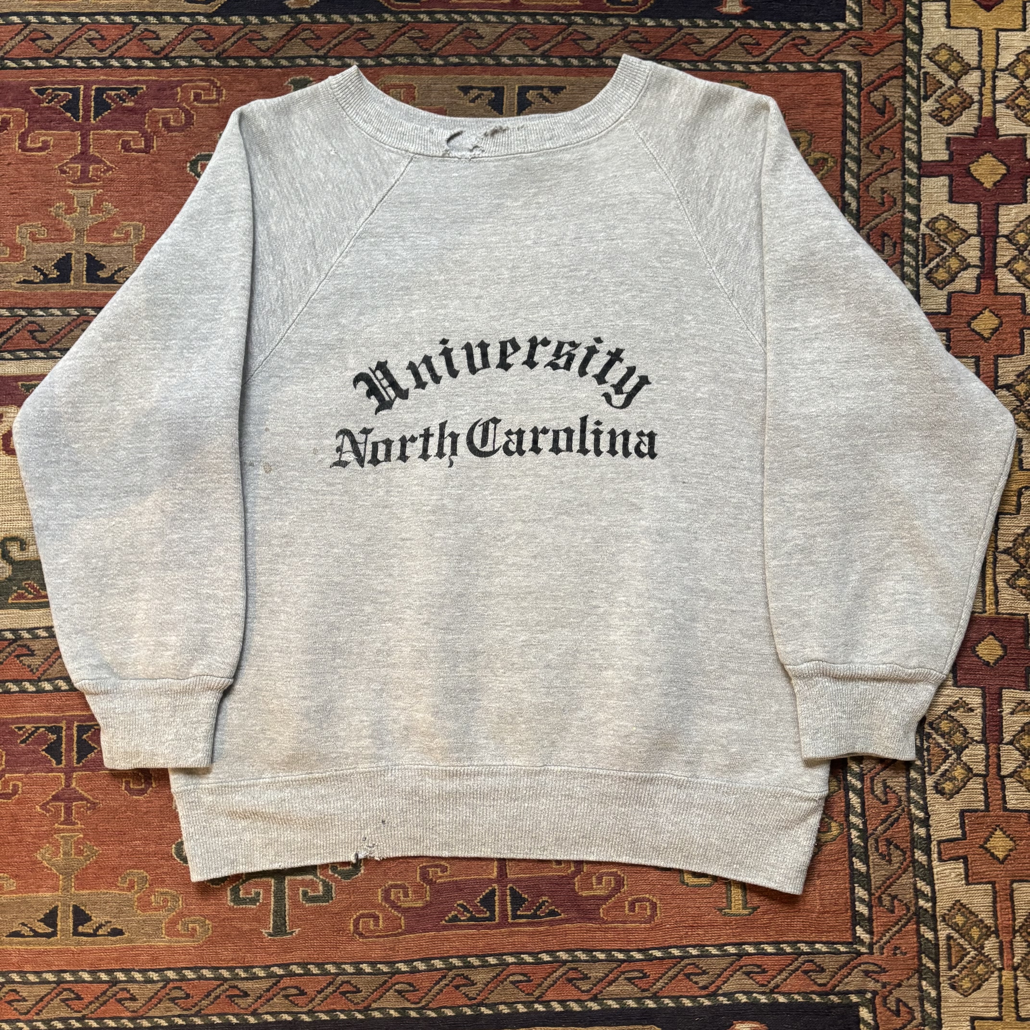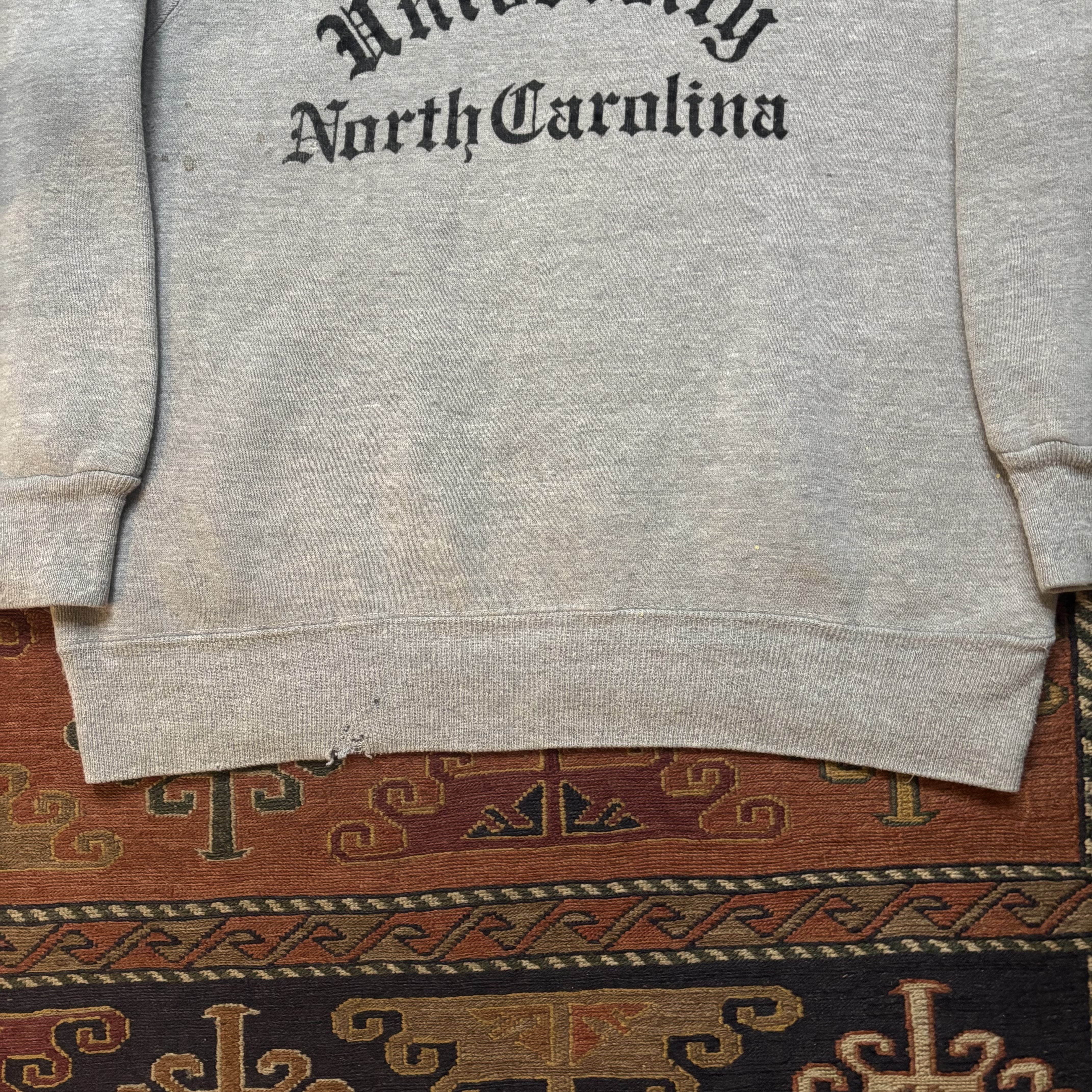 Vintage University of North Carolina grey crewneck sweatshirt made by Velva Sheen around the 1970s. Garment features raglan sleeve, old english font, and thick waist band. Item is in a distressed condition, please see photos for more details. Tag has been partially removed but feels like all cotton, made in USA. Cool, classic, ready to wear.